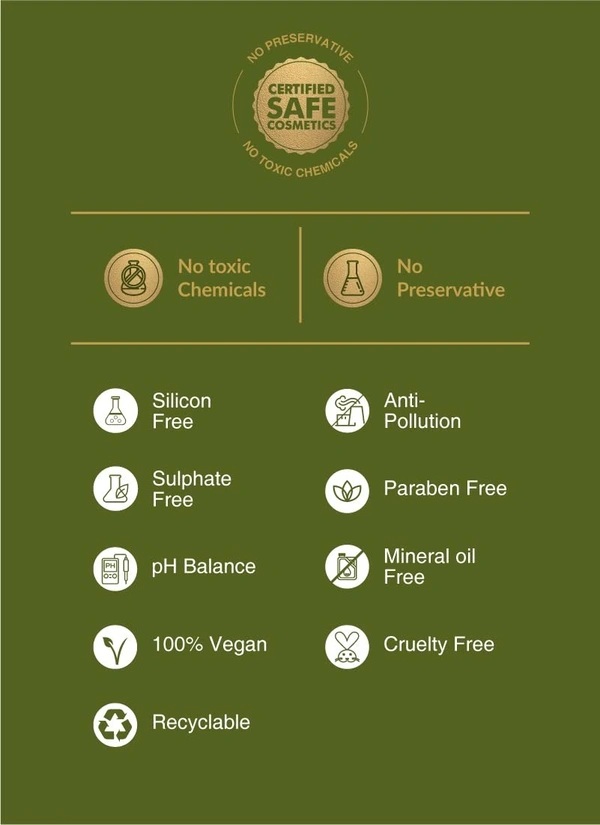 - OUR PROMISE: No toxic chemicals, Preservative free, Paraben free, Silicon free, Sulphate free, Mineral oil free, Anti-pollution, pH balanced, Cruelty free, 100% vegan, and Recyclable.